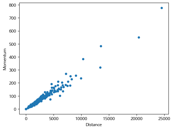 # dataframe을 이용해서 x축에 'Distance'컬럼, y축에 'Momentum' 컬럼의 데이터를 설정해서 산점도를 그려보세요.