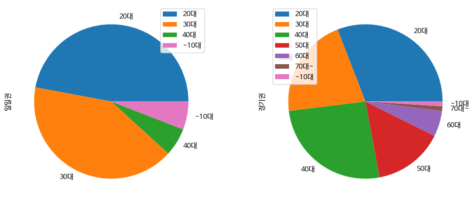 #위에서 구성된 빈도교차표를 이용해서 '일일권', '정기권'에 대한 파이차트를 그려보세요.