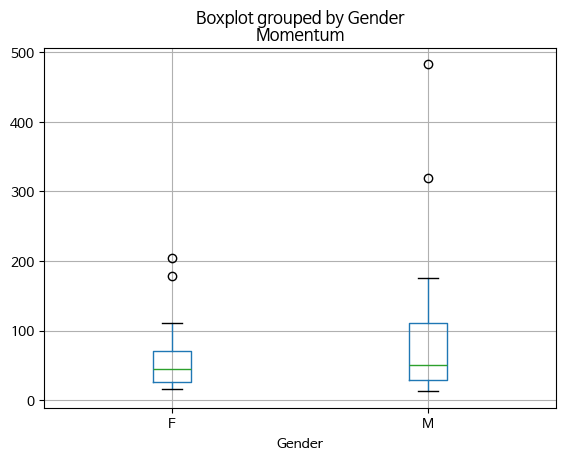 # 'Momentum' 컬럼의 정보를 'Gender'별로 구분해서 boxplot을 그리고 해석해보세요.