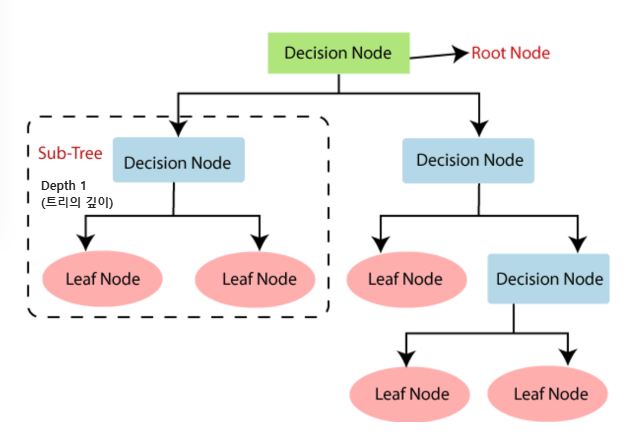 - 트리 구조로 학습 → Root Node, Decision Node, Leaf Node, Depth 개념 중요