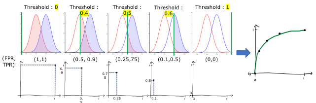 - 0~1 값 변화에 따라 FPR, TPR 값이 변하며 ROC 커브가 그려지고, 면적이 결정됨